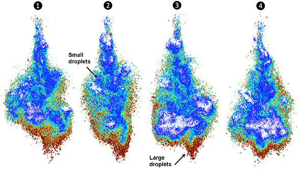 Understanding disease spreading through high-speed imaging (4000 images per second) of respiratory droplets. A person saying the letter "P" that creates a large number of droplets. These droplets evaporate and some will become aerosols that are suspended in the air for a long time and can contribute to disease spreading.