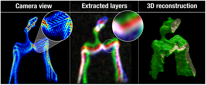 The multiplexed patterns allows FRAME to acquire several images in a single exposure. This can be used to acquire several images in an extremely rapid succession, capture 3D data or instantaneous multispectral imaging.